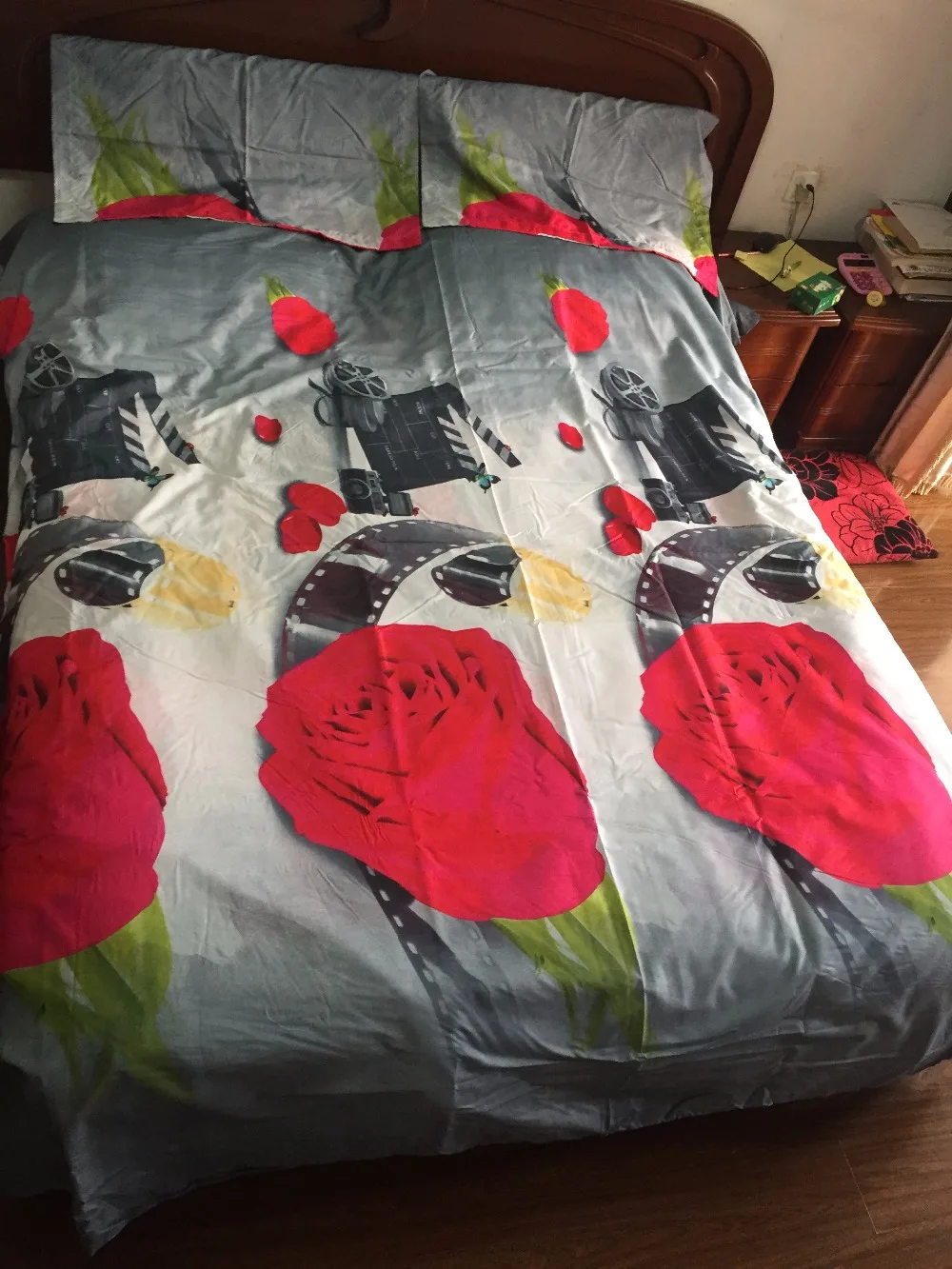 4pcs Vintage Style Red Rose And Movie Camera Film Print Bedding Set Double Queen Size 200 230cm Duvet Cover Grey Color Linens 3d In Bedding Sets From
